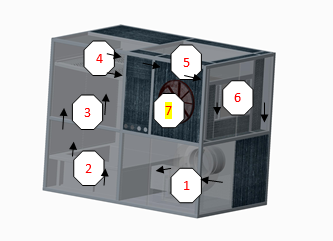 (結(jié)構(gòu)示意圖) 熱風(fēng)(1)風(fēng)機(jī)正壓力輸送力 (2)料斗下腔 (3)料斗上腔 (4)通過粗效過濾到頂腔 (5)經(jīng)過第二道過濾網(wǎng)到換熱上腔 (6)再到換熱腔 (1)受風(fēng)機(jī)負(fù)壓吸力再回風(fēng)機(jī) (7)是外掛風(fēng)機(jī),它作用是幫助外冷凝器降溫散熱的,與內(nèi)循環(huán)沒有結(jié)構(gòu)關(guān)系。