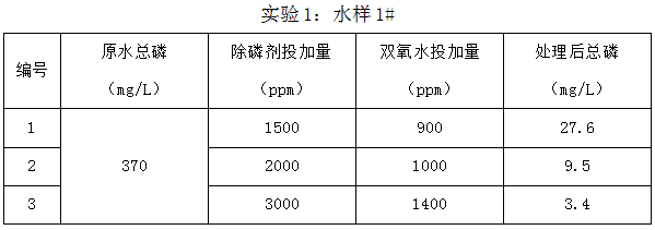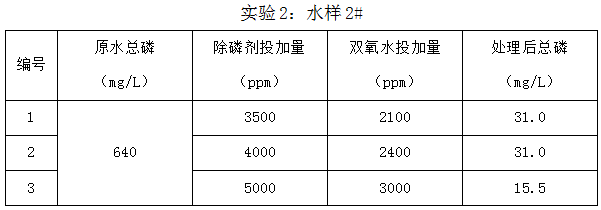 3、實驗結論 (1)若原水總磷370 mg/L,每噸廢水投加2公斤除磷劑和1公斤50%濃度雙氧水即可將總磷降至10 mg/L以下。 (2)若原水總磷640 mg/L,每噸廢水投加5公斤除磷劑和3公斤50%濃度雙氧水即可將總磷降至20 mg/L以下。
