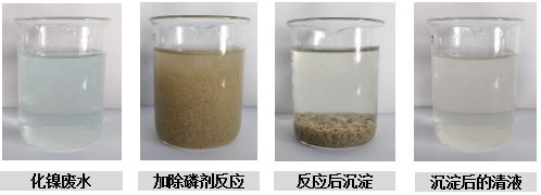 二、產品特點: 1、除磷效率高,除磷劑加藥量與總磷去除量的比值高達5:1; 2、除磷徹底,配合相應的處理流程,處理出水總磷可處理到0.5 mg/L以下; 3、應用范圍廣,磷絡合能力強,可去除有機磷、焦磷、亞磷、次磷酸鹽。 三、使用報告 (一)成都某工業(yè)園 1、概述 成都某工業(yè)園生產過程中有化學鍍鎳工藝,該工藝以次磷酸鹽為還原劑,氧化后轉化為亞磷酸鹽。 2、實驗過程 取適量工業(yè)園廢水站化鎳廢水,投加適量RECY-DAP-01型除磷劑和適量50%濃度雙氧水,攪拌反應60分鐘,調節(jié)適宜pH值,滴加PAM絮凝沉淀,靜置10分鐘后觀察混凝沉淀效果,取上清液待測。
