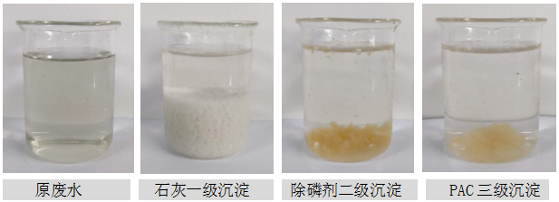 東莞某陽極廠在生產過程中會產生廢水,原水總磷濃度為1500-2500 mg/L,原有處理工藝為投加石灰三級沉淀,存在總磷去除不穩(wěn)定的問題。 取適量原廢水,投加石灰調節(jié)適宜pH值,投加PAM進行一級沉淀,靜置10分鐘;取適量沉淀后的上清液,投加1000 ppm的除磷劑,調節(jié)適宜pH值,投加PAM進行二級沉淀,靜置10分鐘;取適量沉淀后的上清液,投加1000 ppm的PAC,調節(jié)適宜pH值,投加PAM進行三級沉淀;靜置10分鐘后,過濾上清液測試總磷是否達標。 ![]() (測試數據表)
