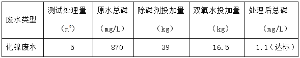 3、實驗結論 若化鎳廢水總磷870 mg/L,每噸廢水投加7.8公斤除磷劑和3.3公斤50%濃度雙氧水即可將總磷降至10 mg/L以下。