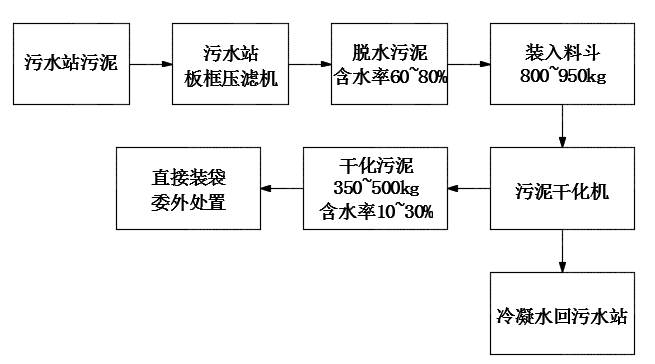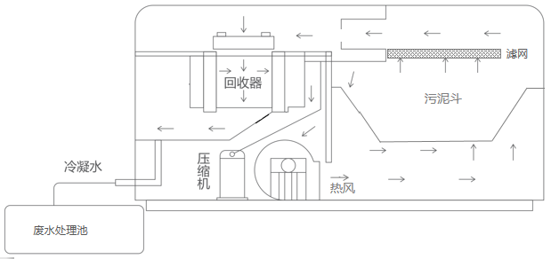 脫水污泥裝入污泥容器內(nèi),污泥中的水分被送風機排出的干燥熱空氣吸收,隨熱空氣一同進入回收器,含水分熱空氣經(jīng)除濕器冷卻,水分與氣體分離,形成冷凝水和干燥空氣,冷凝水進入排水溝或原水池進行廢水處理。干燥空氣經(jīng)熱泵加熱成為干燥熱空氣,經(jīng)送風機排出后重新干化污泥。