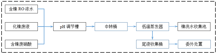 (RS-EP型蒸發(fā)器現(xiàn)場圖) 二、技術(shù)應(yīng)用 將某線路板企業(yè)廢水中的含鎳RO濃水、化鎳廢液以及含鎳廢硝酸分別單獨收集,進行pH調(diào)節(jié)后,自流進入到中轉(zhuǎn)桶,然后直接進入蒸發(fā)設(shè)備蒸發(fā)處理。 ![]() (廢液處理工藝流程圖) 三、處理效果 原水情況表 ![]() 現(xiàn)場運行情況表 ![]()