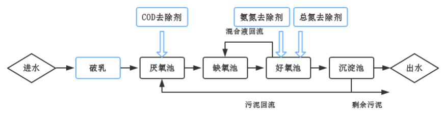 1、投加RECY-DAE-01型破乳劑,破除廢水乳化體系并凝結(jié)有機(jī)懸浮物,去除大部分COD;