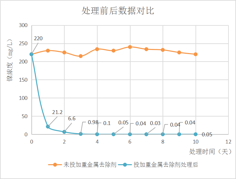 案例一:某模具廠廢水中含有鎳離子3-5g/L,建議每噸水加入0.1-0.5公斤RECY-DAM-02型重金屬去除劑后,鎳含量穩(wěn)定降至0.1mg/L以下。