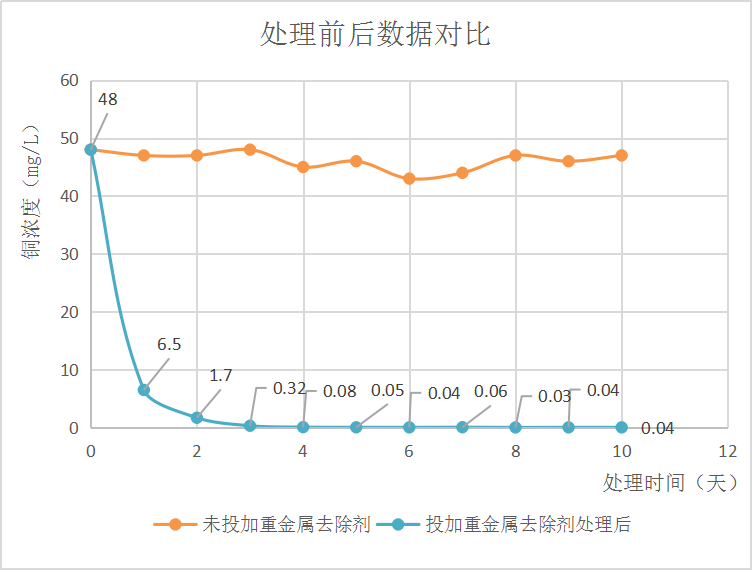 現(xiàn)將現(xiàn)場工藝調(diào)整為兩級沉淀,配合投加RECY-DAM-02型重金屬去除劑處理后,穩(wěn)定降至0.05 mg/L以內(nèi),處理成本降低70%。 ![]()