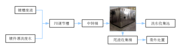 鍍槽廢液和鍍件漂洗廢水可以收集到一起后共同處理。參考以下流程圖: ![]() 廢液進(jìn)入蒸發(fā)設(shè)備蒸發(fā)后在30-40℃時(shí)汽化,汽化蒸汽遇冷形成冷凝液,其各項(xiàng)污染物濃度較低,可納入現(xiàn)有洗水處理設(shè)施進(jìn)行處理;廢液中絕大部分污染物質(zhì)均存在于濃縮液(可濃縮至15~25%)中,濃縮液從蒸發(fā)設(shè)備直接排放至濃縮尾液收集桶,達(dá)到一定數(shù)量后委外處置。處理效果參考下表: