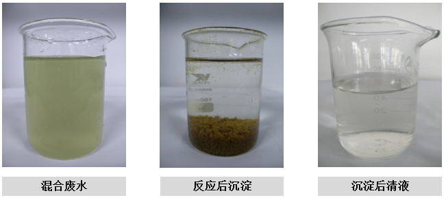 2、取適量混合廢水投加適量除磷劑和適量雙氧水,攪拌反應30分鐘,調(diào)節(jié)合適的pH,投加PAM絮凝沉淀,