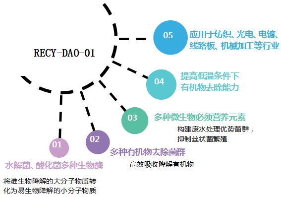 RECY-DAO-01型COD去除劑含有多種菌類(lèi)、營(yíng)養(yǎng)素、生物酶,菌落數(shù)≥3*108 CFU/mL,對(duì)于高濃度有機(jī)廢水有徹底的處理作用。