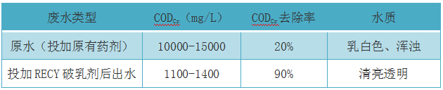 二、破乳劑特點 1、能有效破除水包油(O/W)和油包水(W/O)型廢水中的乳化物和油分; 2、破乳效果穩(wěn)定,CODCr去除率達50-95%; 3、不對水體造成二次污染、不影響生化系統(tǒng)微生物活性。 三、應用效果 深圳某企業(yè)含油廢水為油包水(W/O)體系,難以破除其油分結構,混凝沉淀效果差。