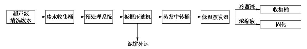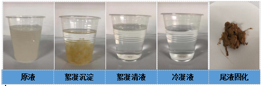 將高COD廢水收集到收集桶,當(dāng)收集桶達(dá)到指定液位時(shí),泵至預(yù)處理系統(tǒng)進(jìn)行序批式處理,調(diào)節(jié)pH后絮凝反應(yīng),完成后經(jīng)壓濾機(jī)壓濾,泥餅裝袋委外處置,壓濾液經(jīng)中轉(zhuǎn)桶收集后進(jìn)行低溫蒸發(fā)。冷凝液污染物都較低,COD降至100 mg/L以下;大部分污染物均存在濃縮液中,可進(jìn)行固化處理后做固廢委外。