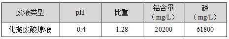氧化化拋一道止水槽的廢液排放周期一般為每天1~2次,以每月將會產(chǎn)生20噸左右的化拋廢液為例,化拋廢酸原液的水質(zhì)情況如表1所示。